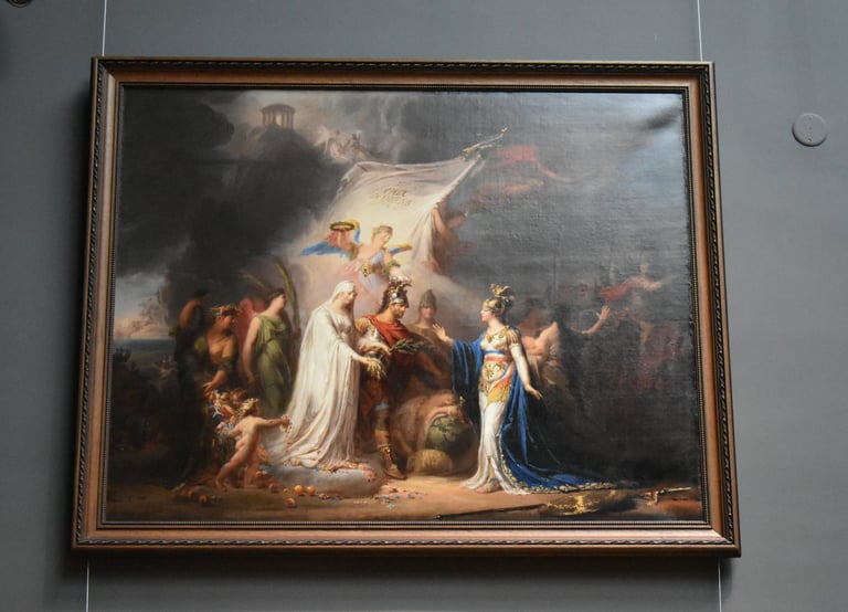 En 1802, la Paix entre la France, et ses alliés, et l’Angleterre est signée. Pour sceller ce traité, un lieu à mi-chemin entre la France et l’Angleterre : Amiens ! L’État fit don de tableaux afin de décorer l’Hôtel de Ville : la ville les garda et ils constituèrent le fonds d’origine pour créer le Musée de Picardie. Les ambassadeurs vinrent à Amiens et conclurent le traité par un moment solennel, transcrit par Jules Ziegler dans un tableau qu’il peignit plus de 45 ans plus tard ! Ce tableau est toujours exposé dans la salle du Congrès à l’Hôtel de Ville. La Paix, quant à elle, fut éphémère puisque quelques mois plus tard, la guerre faisait à nouveau rage entre les deux grandes puissances.